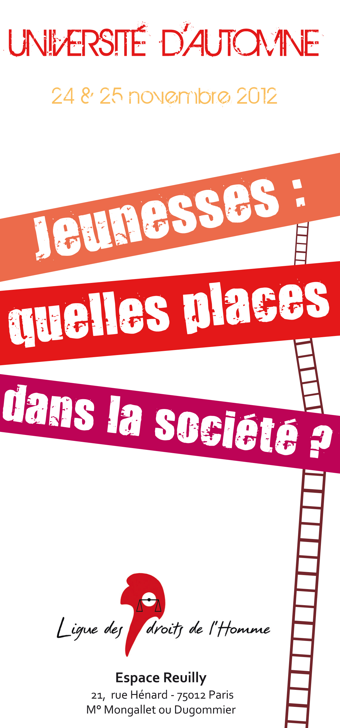 Chaque année, lors de son université d’automne, la LDH se penche sur des questions profondément en lien avec les évolutions de nos sociétés. En 2012, cette université aura lieu les 24 et 25 novembre à Paris. Il s’agira d’interroger la place des jeunes dans notre pays et à l’échelle européenne, de voir dans quelle mesure les générations sont en passe de devenir une nouvelle clé de lecture des fractures centrales de la société française. Si les contours de la « jeunesse » restent mal définis, si cette étape de la vie se caractérise par une grande variété de situations, les chiffres montrent que, d’une manière générale, les jeunes sont plus exposés que leurs aînés à la précarité du marché du travail et au chômage. À partir des années 1980, la durée des études s’est allongée, mais en même temps l’entrée des jeunes sur le marché du travail s’est faite plus tardivement, plus difficilement aussi pour ceux qui sortent du système scolaire sans qualification. Les inégalités sociales et les inégalités de genre entre les jeunes ont tendance à se creuser selon leur origine sociale et leur zone de résidence, et leur niveau de vie relatif tend à décroître comparé à celui des générations précédentes, au point que de plus en plus de jeunes vivent en dessous du seuil de pauvreté. L’accès des jeunes à l’ensemble des droits sociaux est aujourd’hui à construire.