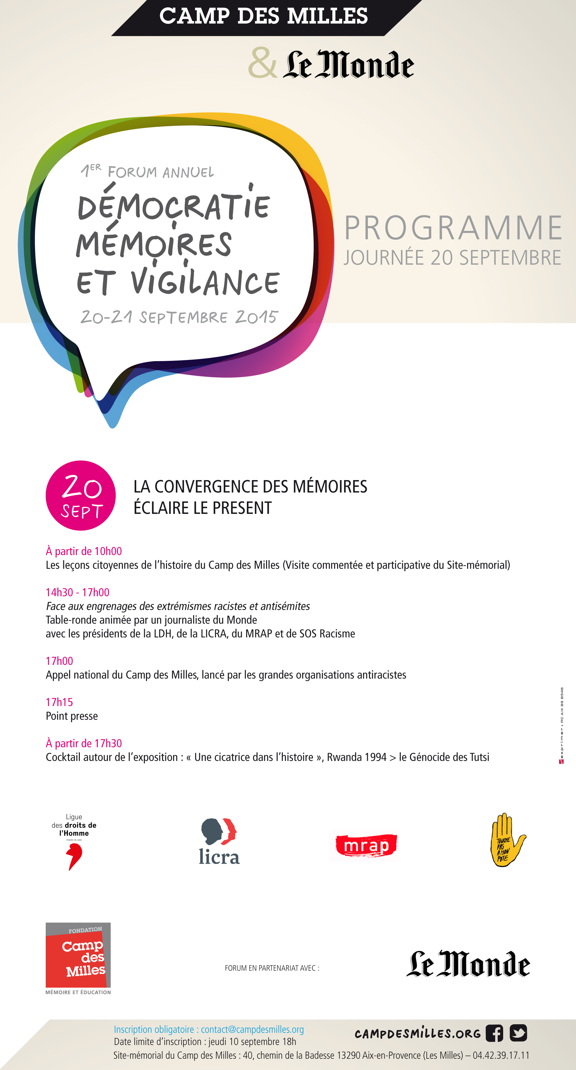 La LDH, la Licra, le Mrap, SOS Racisme et la Fondation du Camp des Milles vous invitent à la journée qu’elles organisent conjointement autour de l’appel national contre les racismes et l’antisémitisme, le dimanche 20 septembre 2015.
