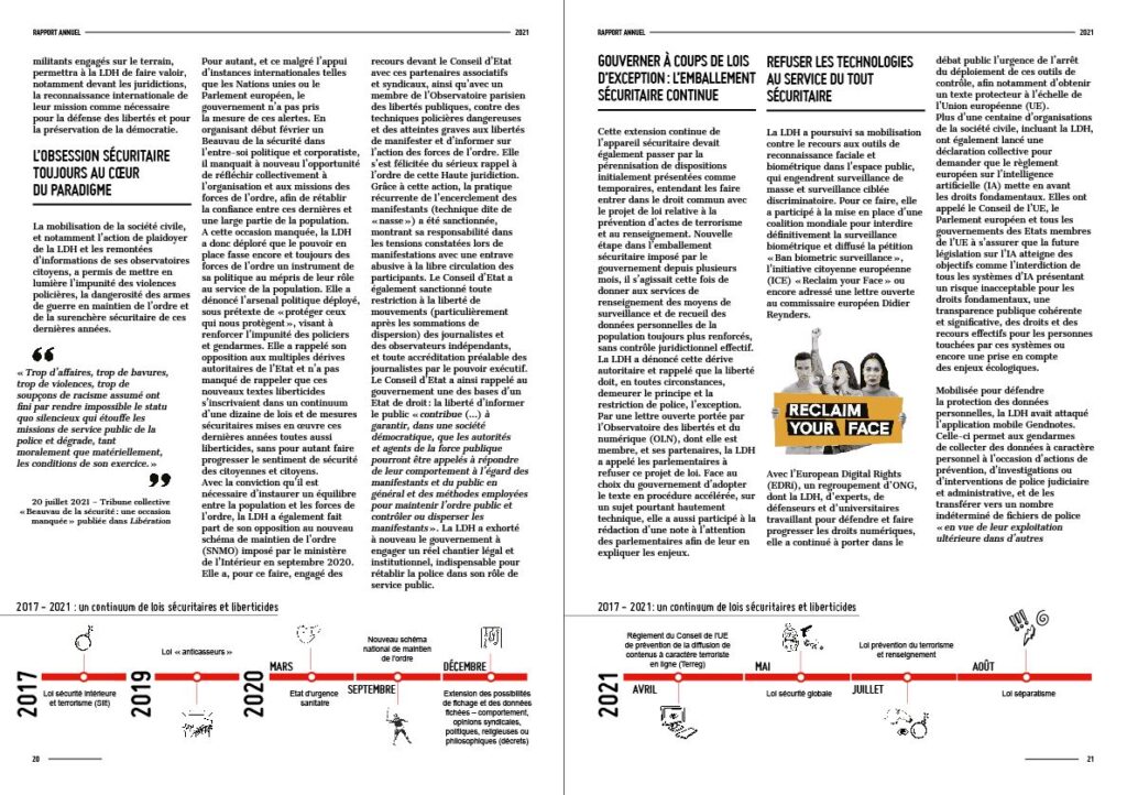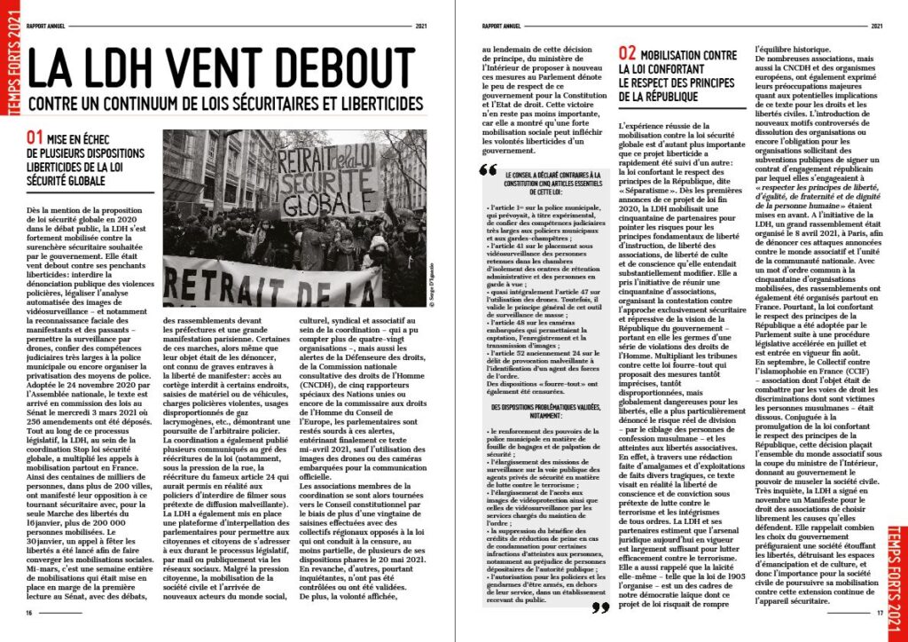 Retour sur nos combats en 2021 sur nos multiples champs d’action : défense des droits et libertés, des droits des étrangers, protection de l’environnement, droits des femmes, thématiques internationales, etc. Avec un zoom sur nos temps forts : mobilisation contre les lois « sécurité globale » et « séparatisme ».