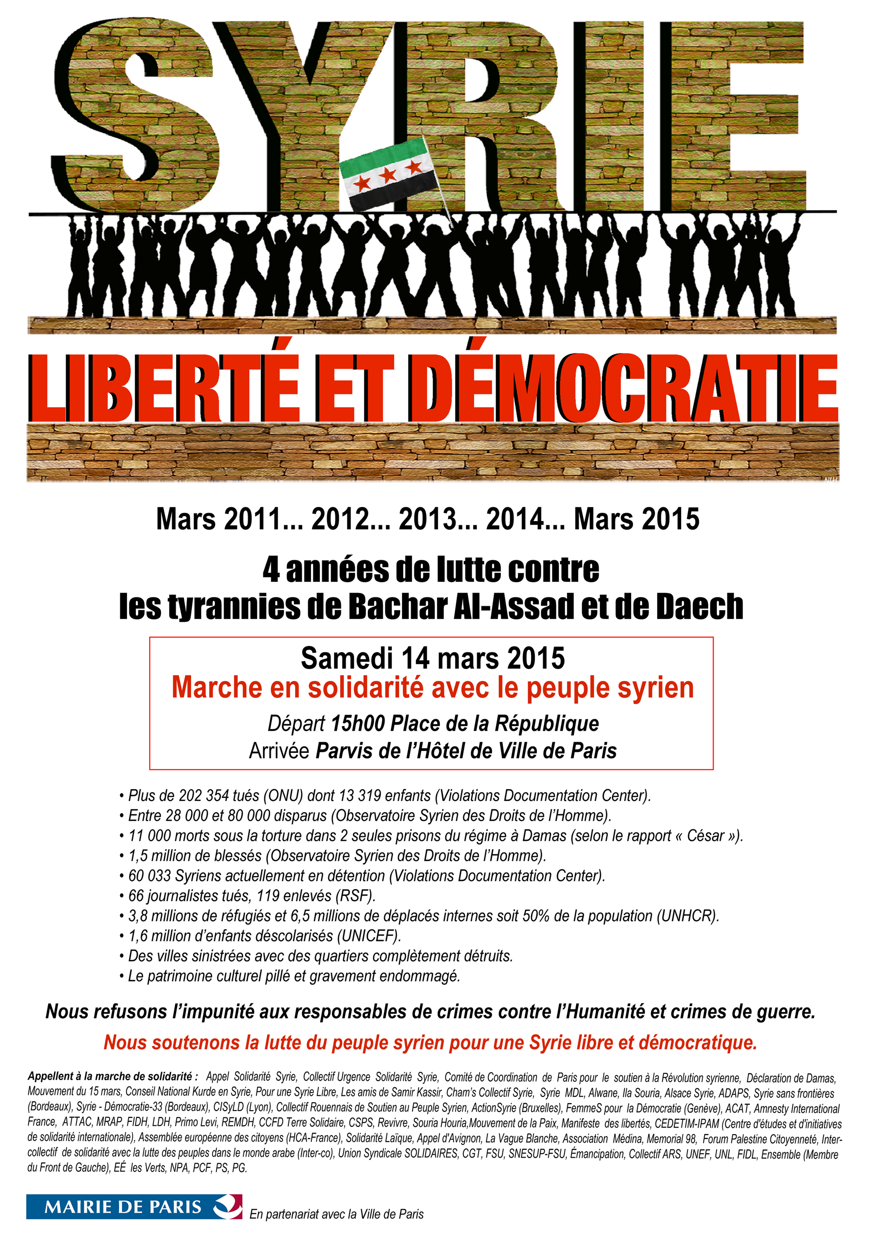 Partout dans le monde > Maghreb - Moyen-Orient 09.03.2015 Syrie. Liberté et démocratie Marche en soutien au peuple syrien samedi 14 mars 2015, à 15h, de place de la République au parvis de l’hôtel de ville de Paris Partager la publication "Syrie. Liberté et démocratie" FacebookBlueskyMastodonLinkedInE-mailPartager...