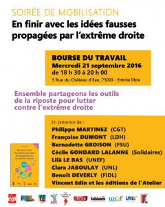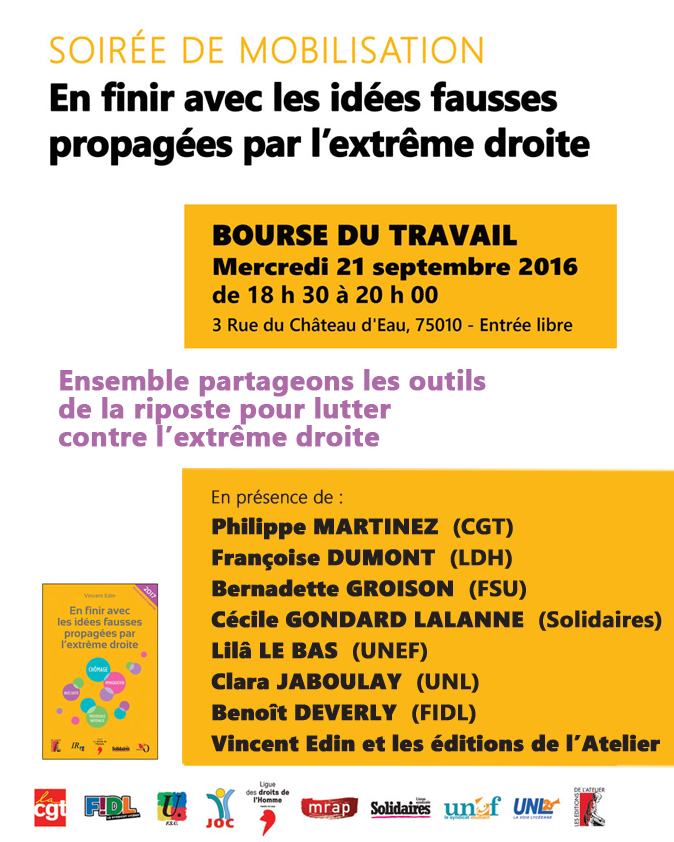 Soirée de mobilisation à la Bourse du travail, à Paris, le mercredi 21 septembre, de 18h30 à 20h, à l’occasion de la sortie du livre En finir avec les idées fausses propagées par l’extrême droite.