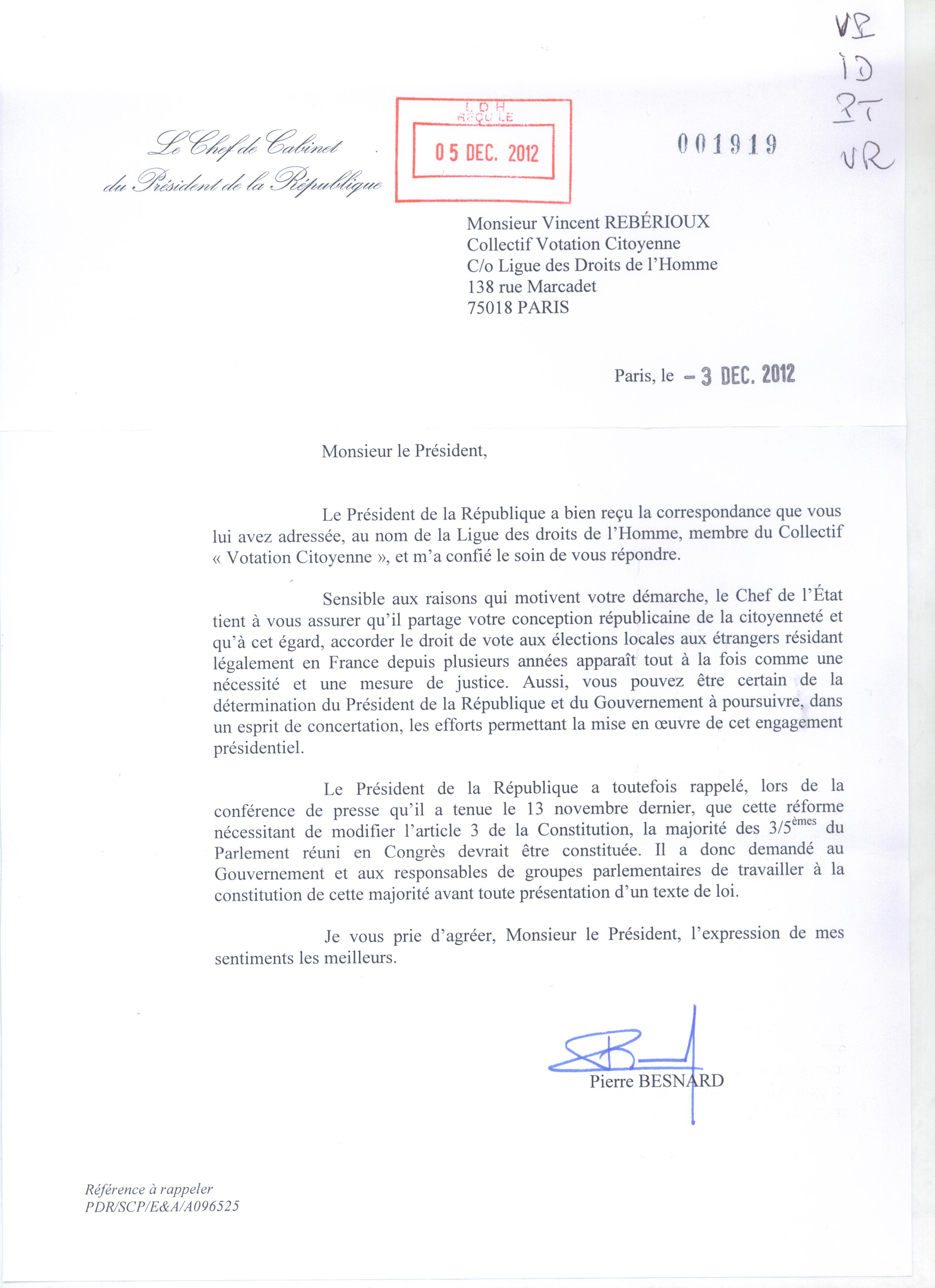 Le 7 novembre dernier, le collectif « Votation citoyenne » a interpellé le président de la République et le Premier ministre sur la question du droit de vote des étrangers, en leur adressant respectivement une lettre ouverte.Téléchargez la lettre adressée au président de la République