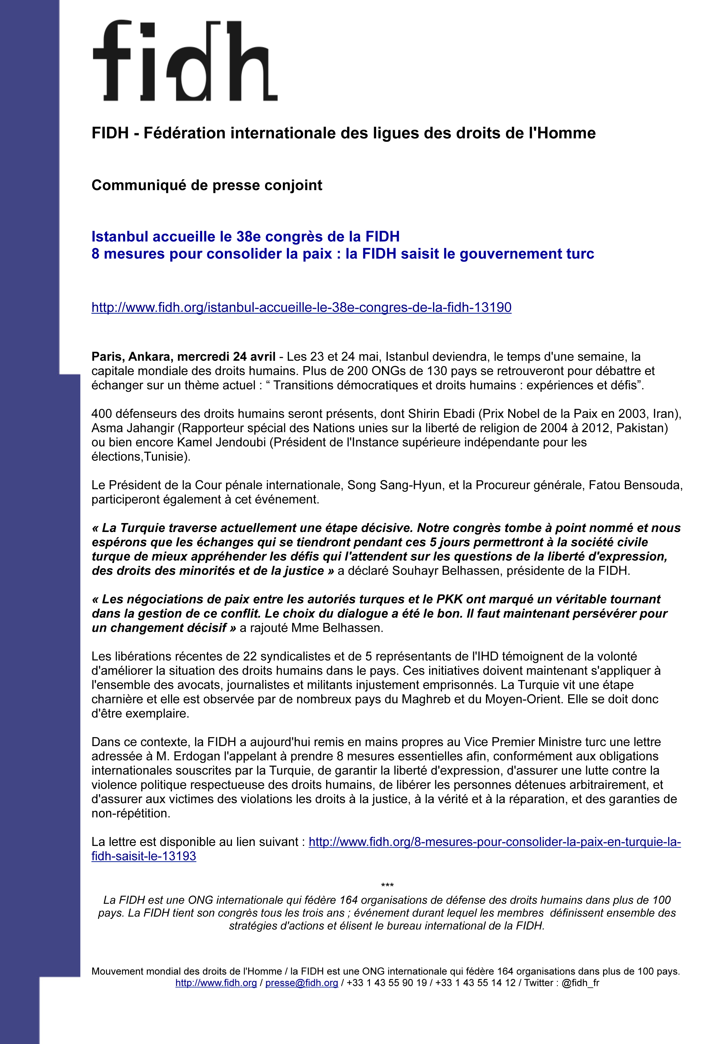 8 mesures pour consolider la paix : la FIDH saisit le gouvernement turc