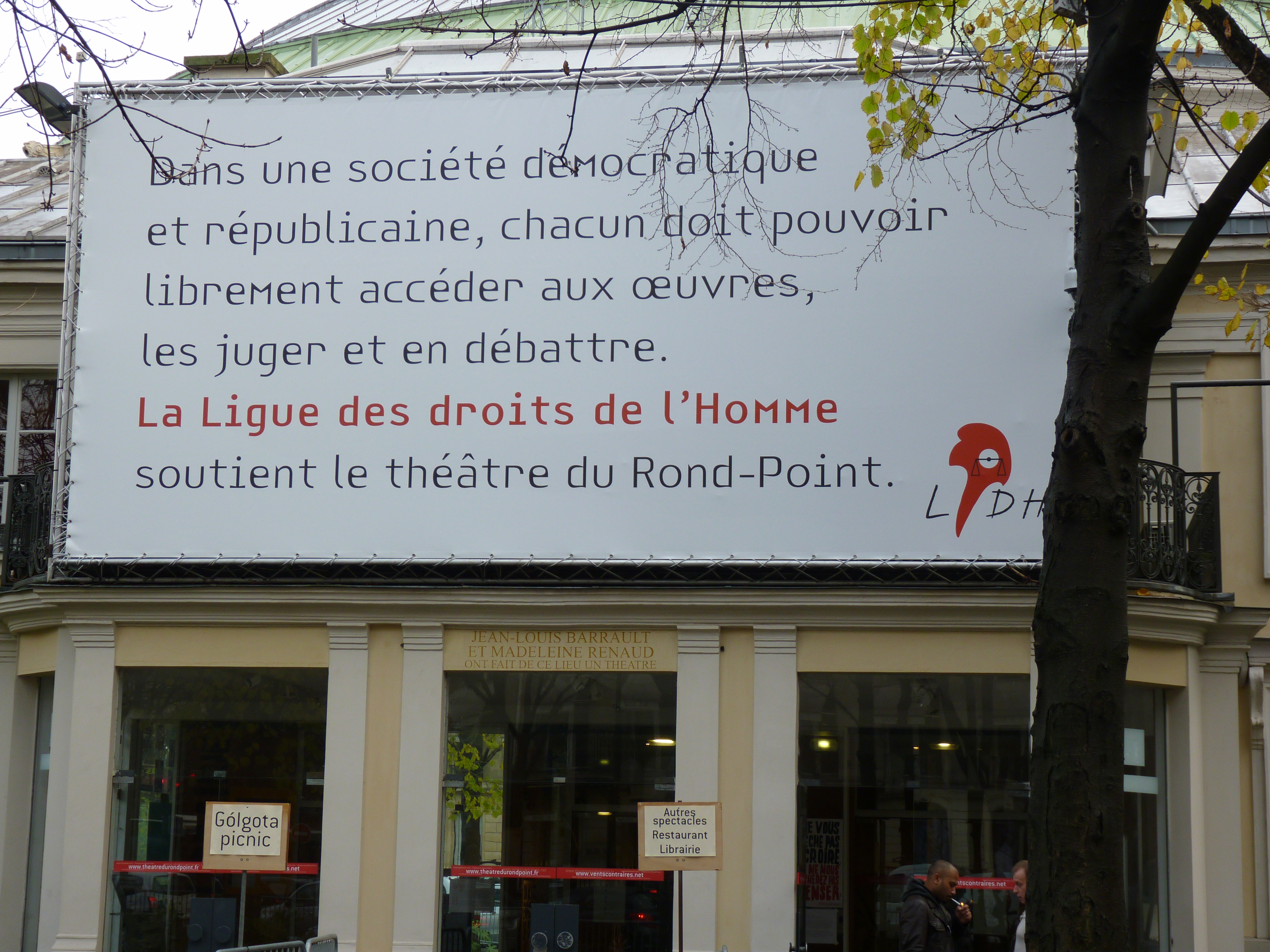 La Ligue des droits de l’Homme, la Ligue de l’enseignement, le Snap CGT et le SFA appellent à soutenir la liberté de création devant le Théâtre du Rond-Point qui propose la pièce de Rodrigo Garcia « Golgota Picnic » du 8 au 17 décembre 2011