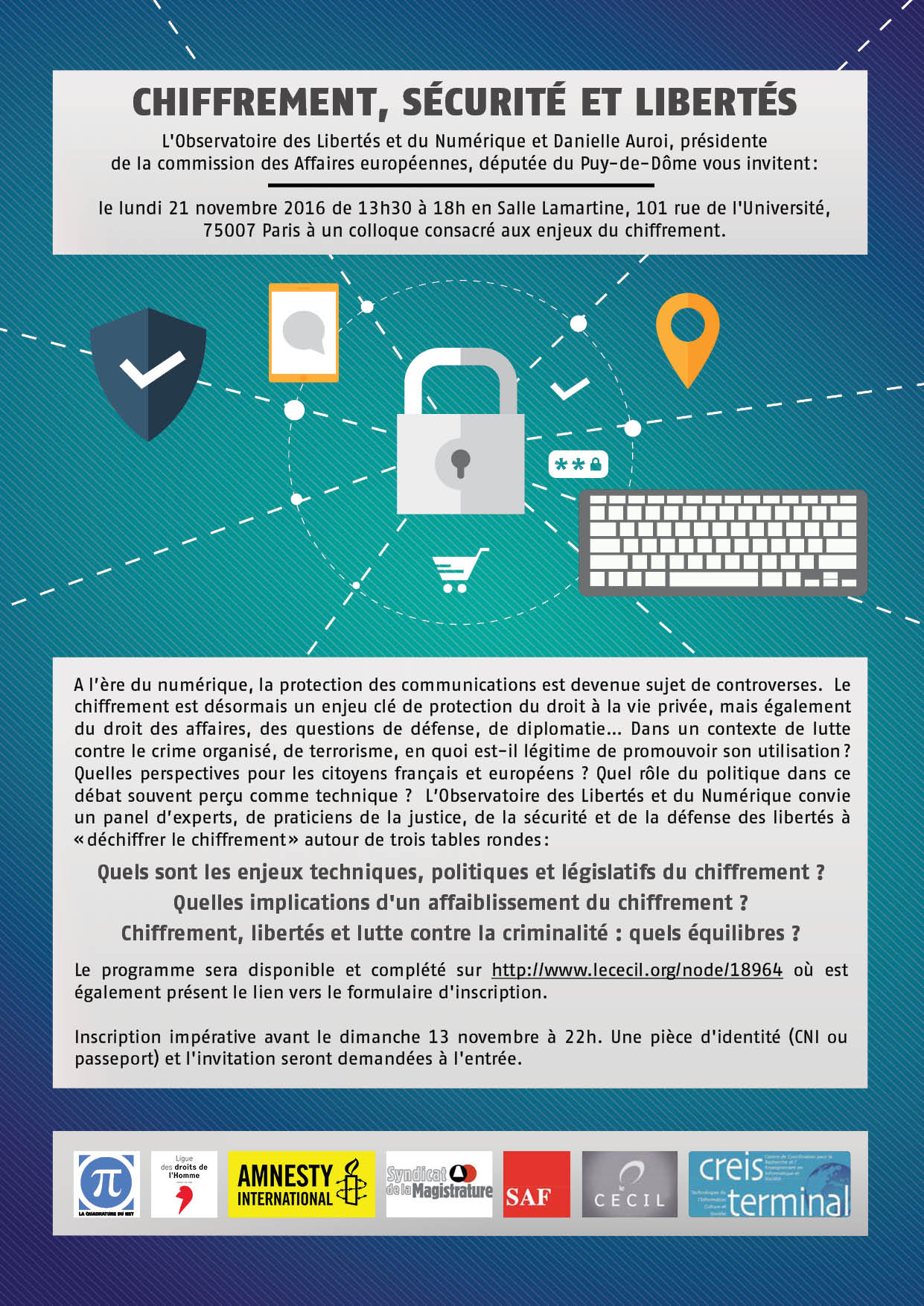A l’ère du numérique, la protection des communications est devenue sujet de controverses. Le chiffrement est désormais un enjeu clé de protection du droit à la vie privée, mais également du droit des affaires, des questions de défense, de diplomatie… Dans un contexte de lutte contre le crime organisé, de terrorisme, en quoi est-il légitime de promouvoir son utilisation ? Quelles perspectives pour les citoyens français et européens ? Quel rôle du politique dans ce débat souvent perçu comme technique ? L’Observatoire des libertés et du numérique convie un panel d’experts, de praticiens de la justice, de la sécurité et de la défense des libertés à « déchiffrer le chiffrement » autour de trois tables rondes :