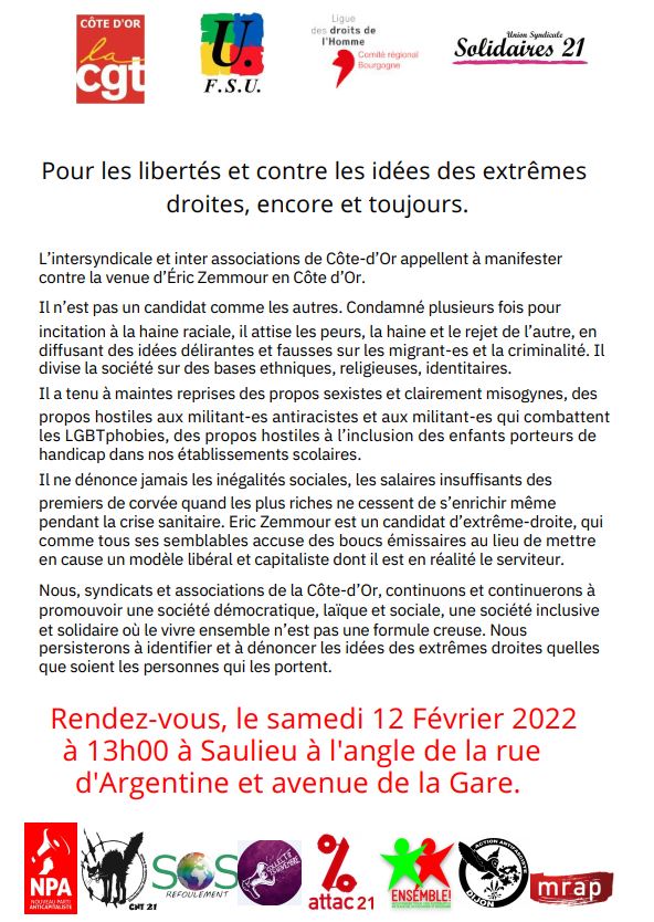 Le samedi 12 février à 13h à l’angle de la rue d’Argentine et de la gare, à Saulieu. L’intersyndicale et inter associations de Côte-d’Or appellent à manifester contre la venue d’Éric Zemmour en Côte d’Or. Il n’est pas un candidat comme les autres. Condamné plusieurs fois pour incitation à la haine raciale, il attise les peurs, la haine et le rejet de l’autre, en diffusant des idées délirantes et fausses sur les migrant-es et la criminalité. Il divise la société sur des bases ethniques, religieuses, identitaires. Lire l’appel