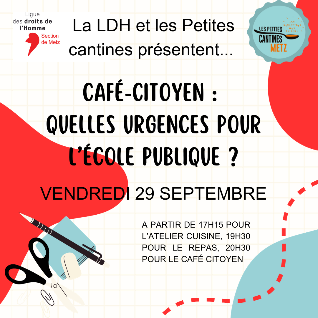La LDH de Metz vous invite à un café citoyen sur le thème « quelles urgences pour l’école publique ? ».