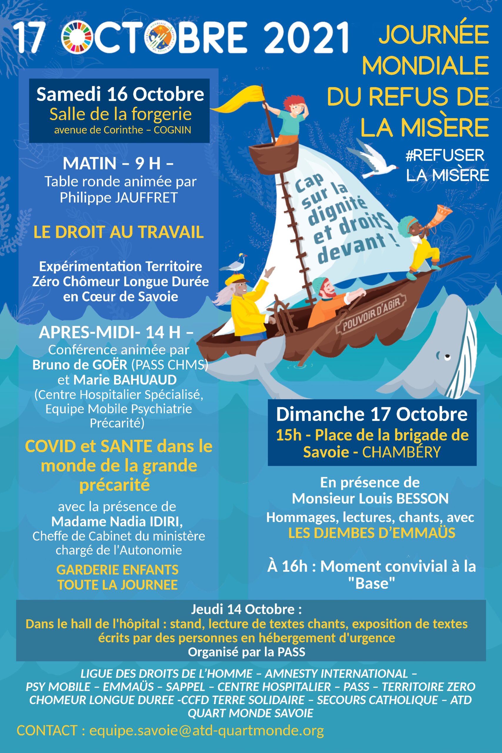 Le dimanche 17 octobre de 15h à 18h, à la place de la Brigade de Savoie à Chambéry. Devant la plaque dédiée à Joseph Wresinski. Il y aura la célébration de la journée mondiale du refus de la misère. Avec la présence de Monsieur Louis Besson.