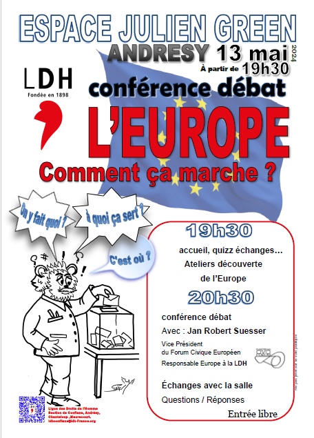 À partir de 20h30 Jan Robert Suesser, Vice-Président du Forum Civique Européen et Responsable Europe à la LDH, échangera avec vous et répondra à vos questions…