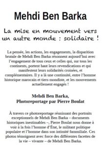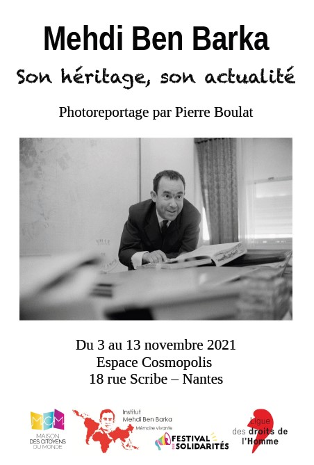Du 3 au 13 novembre, à l’Espace Cosmopolis, à Nantes. Dans le cadre du Festival des solidarités, la Ligue des droits de l’Homme propose un photoreportage « Mehdi Ben Barka » par Pierre Boulat.