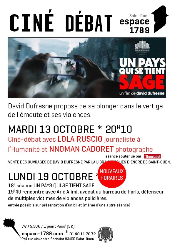 En raison des nouvelles restrictions sanitaires, le projection du film Un pays qui se tient sage le lundi 19 octobre à l’Espace 1789 de Saint-Ouen est avancée à 18h. L’intervention d’Arié Alimi est maintenue, elle aura lieu à 19h40 et sera accessible également aux spectatrices et aux spectateurs ayant déjà vu le film d’une autre séance. Voir le tract / L’évènement Facebook