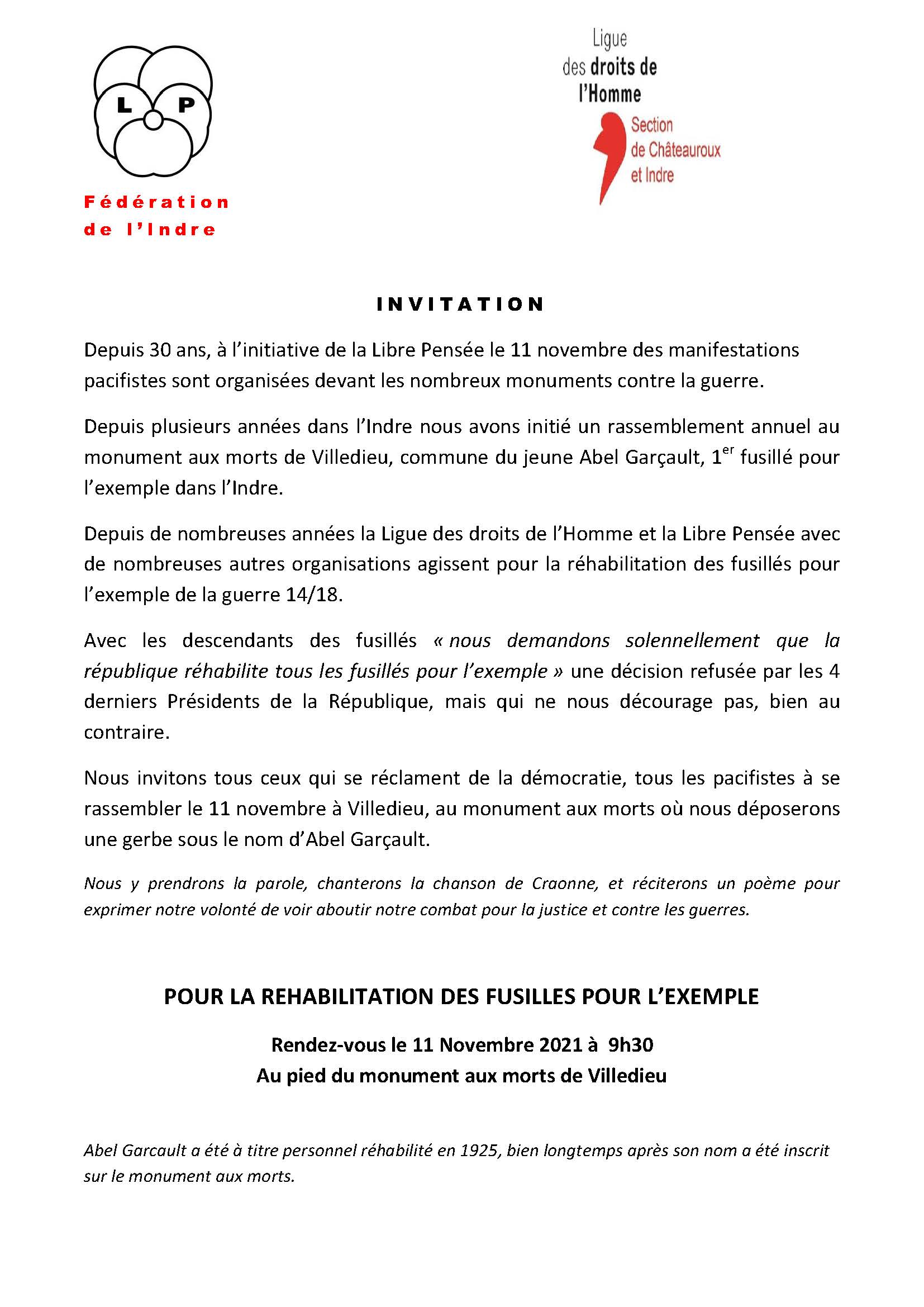 Nous invitons tous ceux qui se réclament de la démocratie, tous les pacifistes à se rassembler le 11 novembre à Villedieu, au monument aux morts où nous déposerons une gerbe sous le nom d’Abel Garçault.