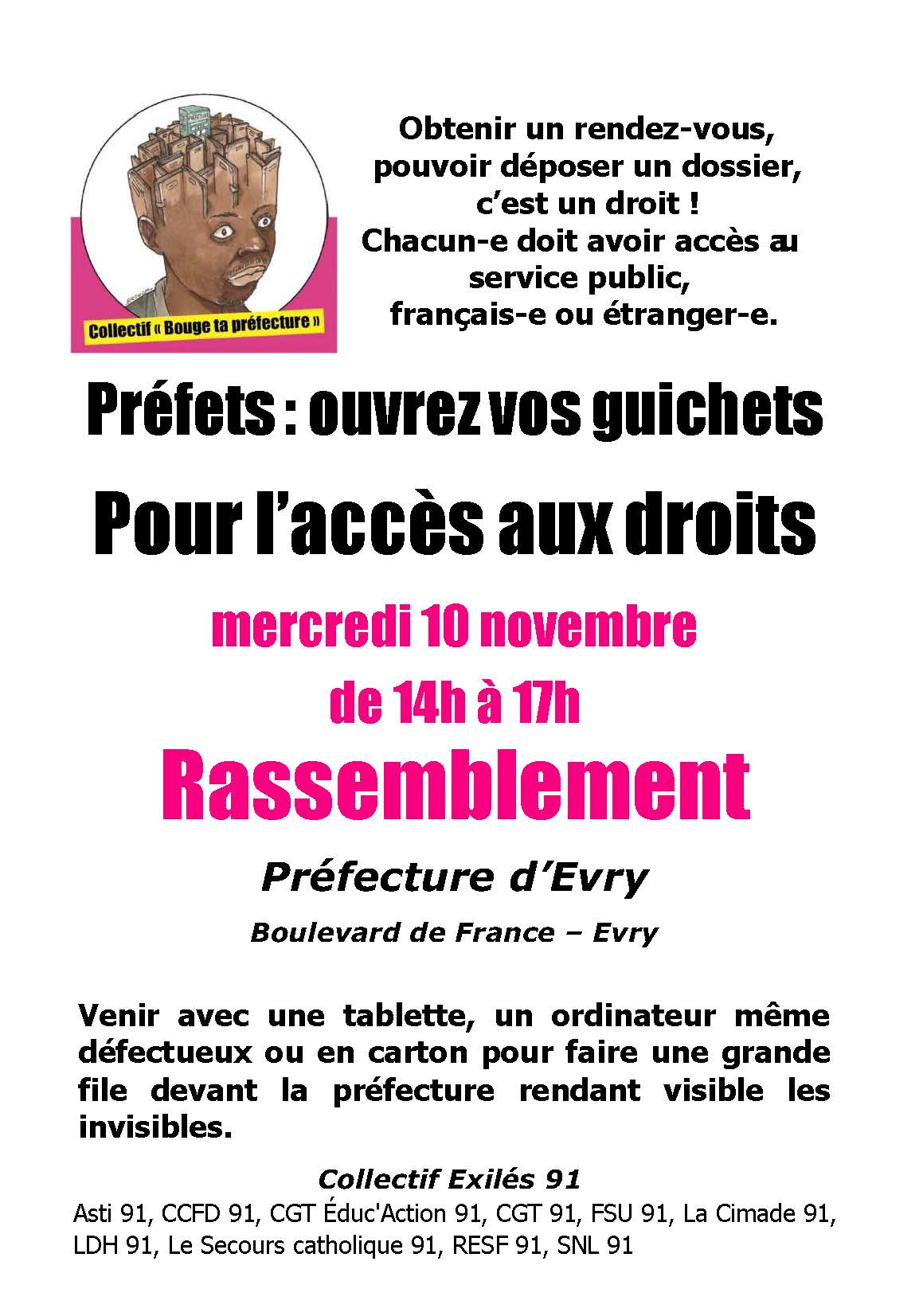 Le but de ce rassemblement est d’exiger des voies alternatives d’accès aux Préfectures afin de permettre à toutes et tous de réaliser leurs démarches.