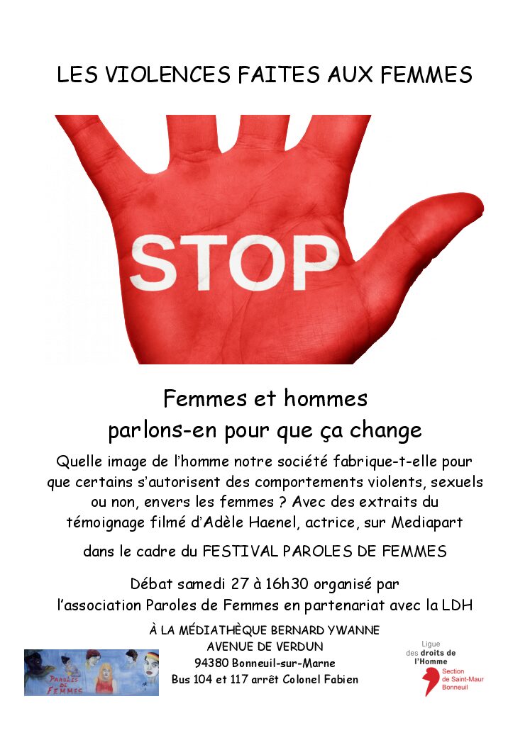 Quelle image de l’homme notre société fabrique-t’elle pour que certains s’autorisent des comportements violents, sexuels ou non envers les femmes? Avec des extraits du témoignage filmé d’Adèle Haenel, actrice sur Médiapart, l’association »Paroles de femmes » et la LDH Saint-Maur/Bonneuil vous proposent d’en débattre.