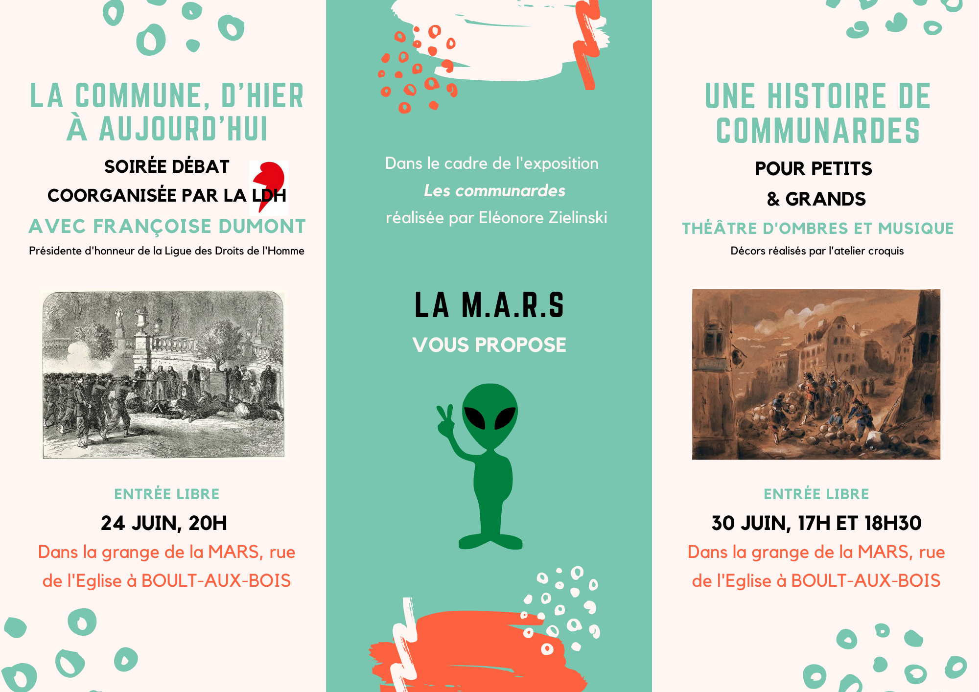Dans le cadre de l’exposition « Les communardes » réalisée par Eléonore Zielinski, la M.A.R.S et la LDH coorganise une soirée débat : « La Commune, d’hier à aujourd’hui ». Le jeudi 24 juin à 20h, en présence de Françoise Dumont, Présidente d’honneur de la Ligue des droits de l’Homme.