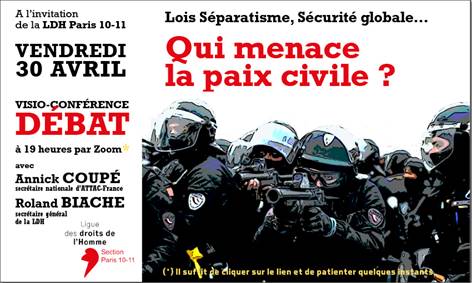 Le vendredi 30 avril à partir de 18h30 : de 18h30 à 19h entre adhérents et à 19h rencontre avec Annick Coupé, secrétaire nationale d’ATTAC et Roland Biache, secrétaire général de la LDH. Le thème en sera  les conséquences des lois « pour une sécurité globale préservant les libertés » et « Séparatisme » sur notre vie démocratique.