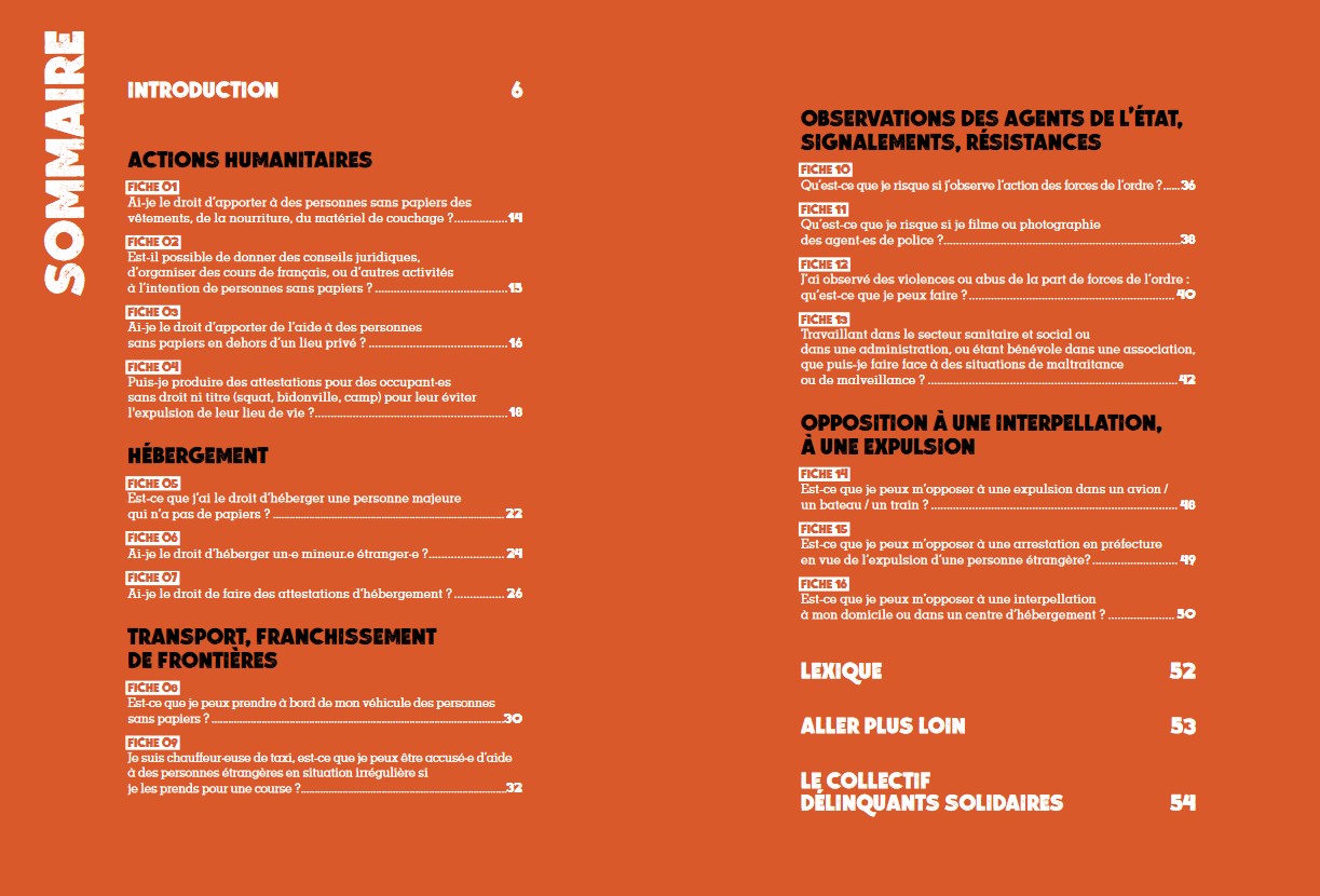 Le guide traite de quatre grands thèmes : les actions humanitaires, l’hébergement, le transport ou le franchissement des frontières, les signalements, résistances et observations des agent-es, mais également les situations d’oppositions à une interpellation ou à une expulsion du territoire.