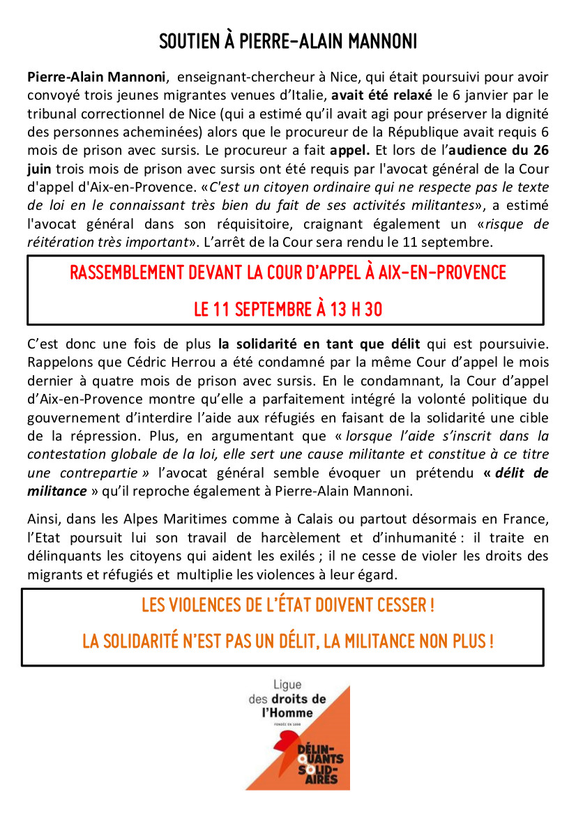 Comme pour Cédric Herrou, Le cercle de silence d’Aix-en-Provence est totalement solidaire de Pierre-Alain Mannoni, il appelle à le soutenir massivement lundi prochain 11 septembre, à 13h30, devant la Cour d’appel. En attendant, nous vous invitons à venir nombreux au cercle de silence qui se tiendra Place de la Rotonde, du côté des Allées Provençales, samedi 9 septembre de 11h30 à midi. Nous y exprimerons notre indignation quant à l’attitude des pouvoirs publics vis-à-vis des migrants.