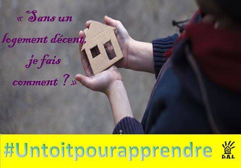 | Créée en septembre 2016, face au nombre de plus en plus important de familles démunies dans les permanences du DAL Toulouse, la campagne regroupe aujourd’hui le DAL Toulouse, la FCPE31, les syndicats enseignants CGT Education et Sud Education ainsi que la LDH.L’année scolaire passée de nombreux petits-déjeuners et goûter d’interpellation ont eu lieu devant des établissements toulousains. Malgré cela les réponses de la Mairie et de la Préfecture n’ont pas toujours été à la hauteur de la situation et nous avons dû parfois occuper des écoles ou camper devant pour obtenir que des familles soient mises à l’abri.
