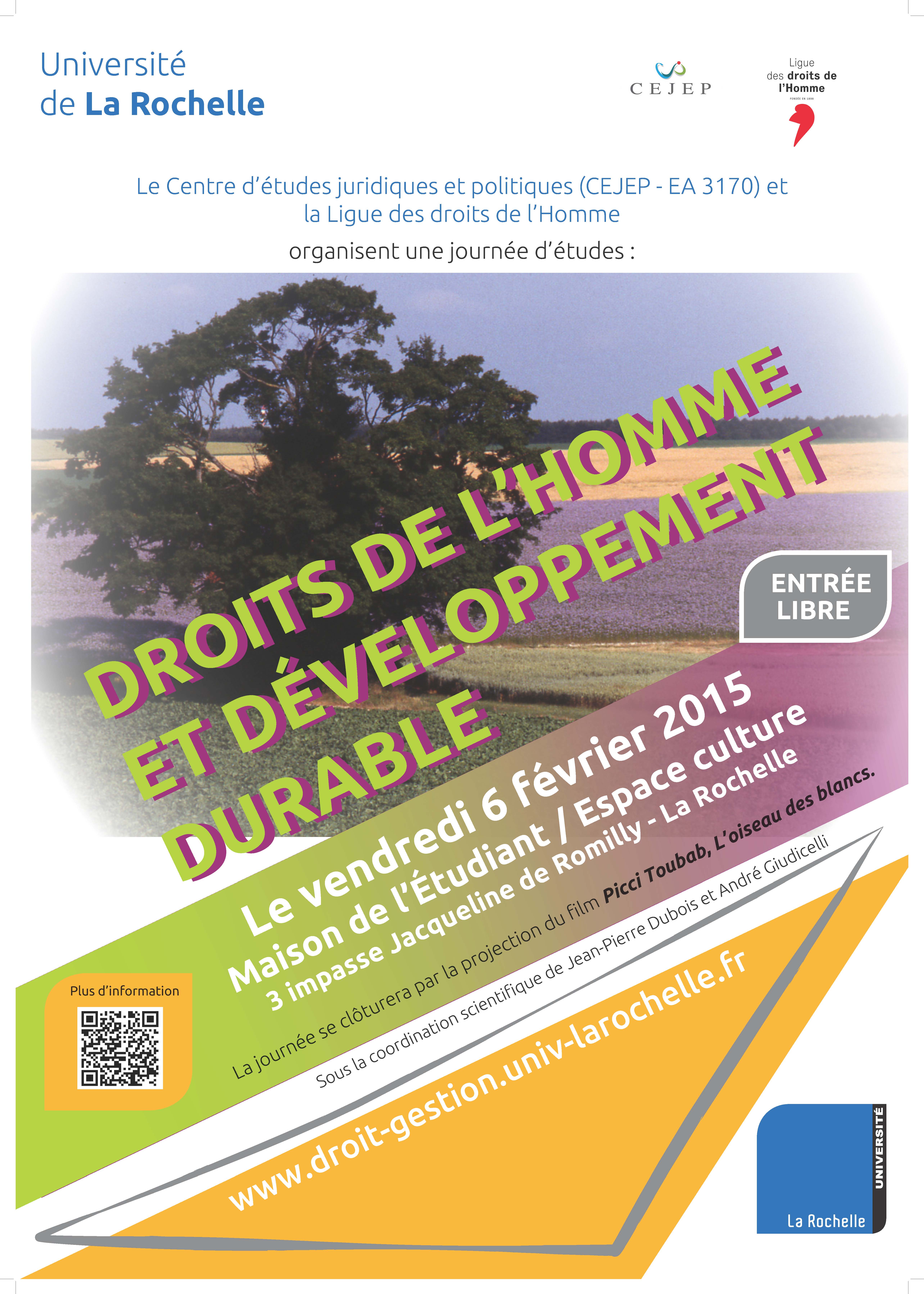 A quelques mois de la Conférence de Paris sur le changement climatique, l’Université de La Rochelle et la Ligue des droits de l’Homme co-organisent le vendredi 6 février 2015 une Journée d’études sur les rapports entre développement durable et droits de l’Homme.