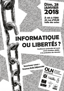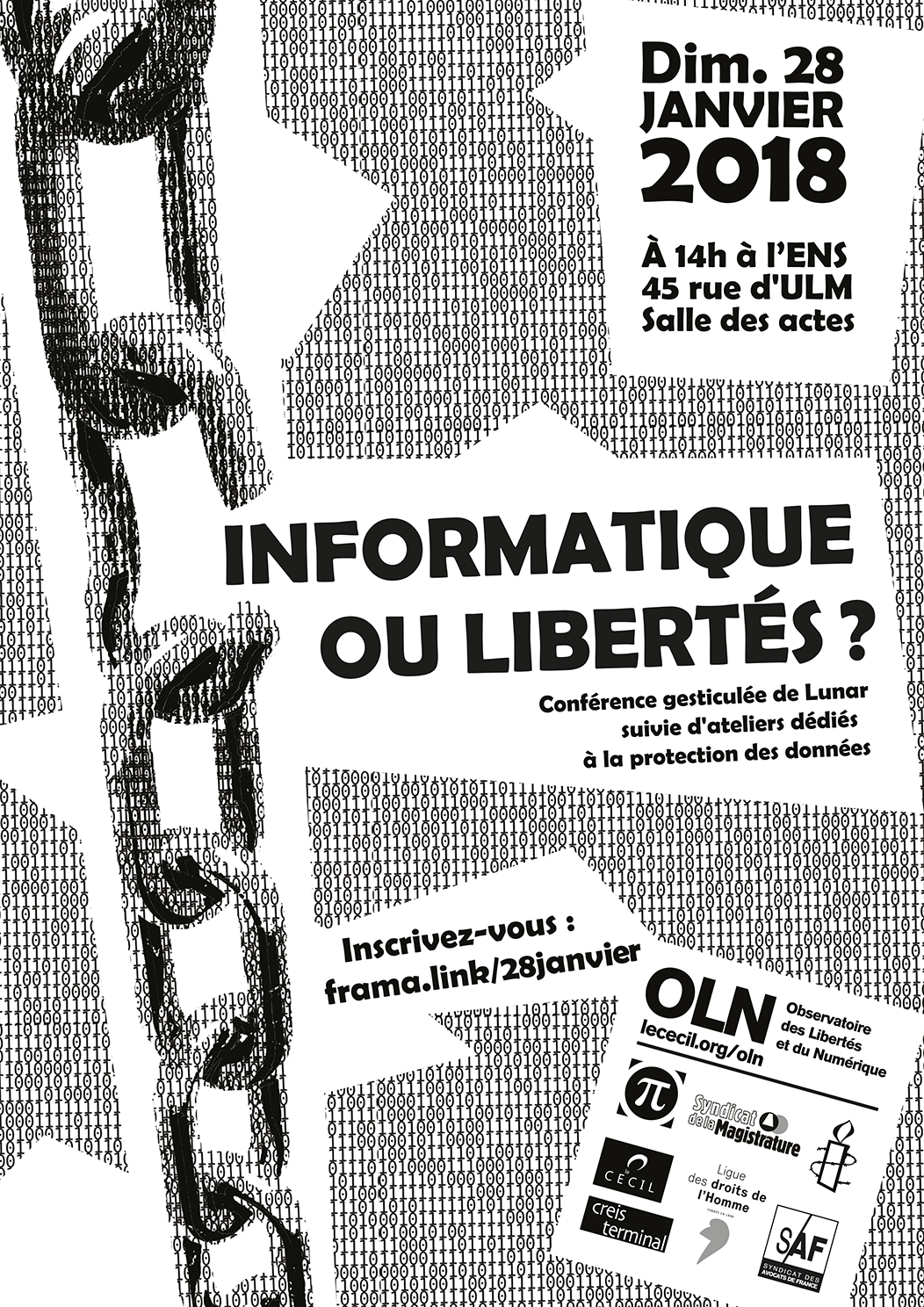 Il est indispensable de s’inscrire pour pouvoir participer à l’événement, pour cela merci d’indiquer nom et adresse mail dans le formulaire disponible ici (ces données ne serviront que pour cette inscription et ne seront pas conservées) : https://frama.link/28janvier