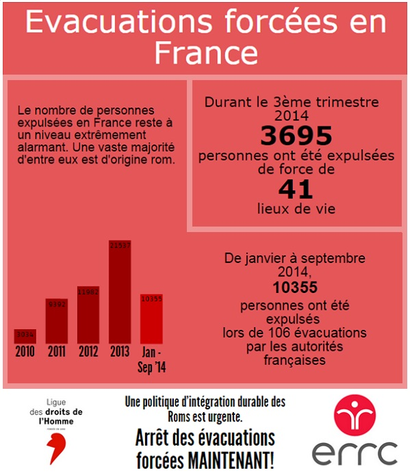 Les autorités françaises ont continué leur politique d’évacuation forcée durant tout l’été. Selon les données du European Roma Rights Centre (ERRC) et de la Ligue des droits de l’Homme (LDH), entre juillet et septembre 2014, un total de 3 769 personnes – principalement roms – ont été expulsées de 43 lieux de vie : 3 695 par les autorités lors de 41 évacuations et 74 suite à deux incendies. Le nombre total de personnes expulsées à cause de cette politique atteint 10 355 en 2014.