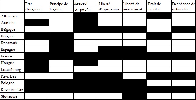Ce récapitulatif a été réalisé à partir des données réunies par Amnesty international pour son rapport « Des mesures disproportionnées ». Il est composé de deux parties. L’une, littérale, donne les mesures nationales de certains pays de l’UE en ce qui concerne l’établissement de l’état d’urgence. La deuxième, en tableau, tente de décrire ce qui pourrait s’appeler état d’urgence, quasi état d’urgence, ou encore comme en Belgique, des lois d’exception, qui sont au nombre de 18 et sont considérés par la LDH belge comme la préfiguration d’un changement de la constitution, même si le gouvernement semble pour l’instant éviter le mot pour se concentrer sur la chose. Où l’on voit que l’éventail des situations est fait de différences qui ne sont que relatives. Ainsi l’Autriche n’a pas l’état d’urgence mais a introduit des mesures de contrôle des migrants pour lutter contre le terrorisme qui sont draconiennes et contraires en tout point aux droits de l’Homme. L’Espagne a introduit dans sa législation des mesures antiterroristes vagues et donc fortement expansives qui fait que les autorités sont autorisées à appliquer la loi de façon disproportionnée et discrétionnaire. Aux Pays-Bas, on ne parle ni d’état d’urgence ni de loi d’exception, mais les mesure adoptées sont sévères et vont jusqu’à la déchéance de nationalité. On remarquera enfin que deux Etats sont présents dans tous les items : la France et le Royaume-Uni.