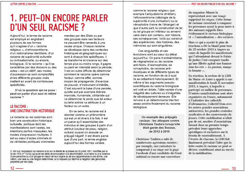 Ce fascicule sur le racisme en est un exemple. Il vise à fournir d’une part un état des lieux des débats de société et d’autre part, à montrer et à expliquer les actions, les prises de position et les mobilisations de l’association. Il n’est pas un manuel – ni d’histoire, ni d’autres disciplines – même s’il mobilise un certain nombre de connaissances interdisciplinaires. Il est une démarche : celle de prendre un peu de recul pour problématiser des questions, proposer des arguments, des éclairages et non seulement mieux porter le combat antiraciste de la LDH, mais surtout le penser ensemble. C’est pourquoi ce travail est collectif et il n’est pas l’œuvre de spécialistes mais une production de militantes et militants qui ont voulu questionner ensemble.