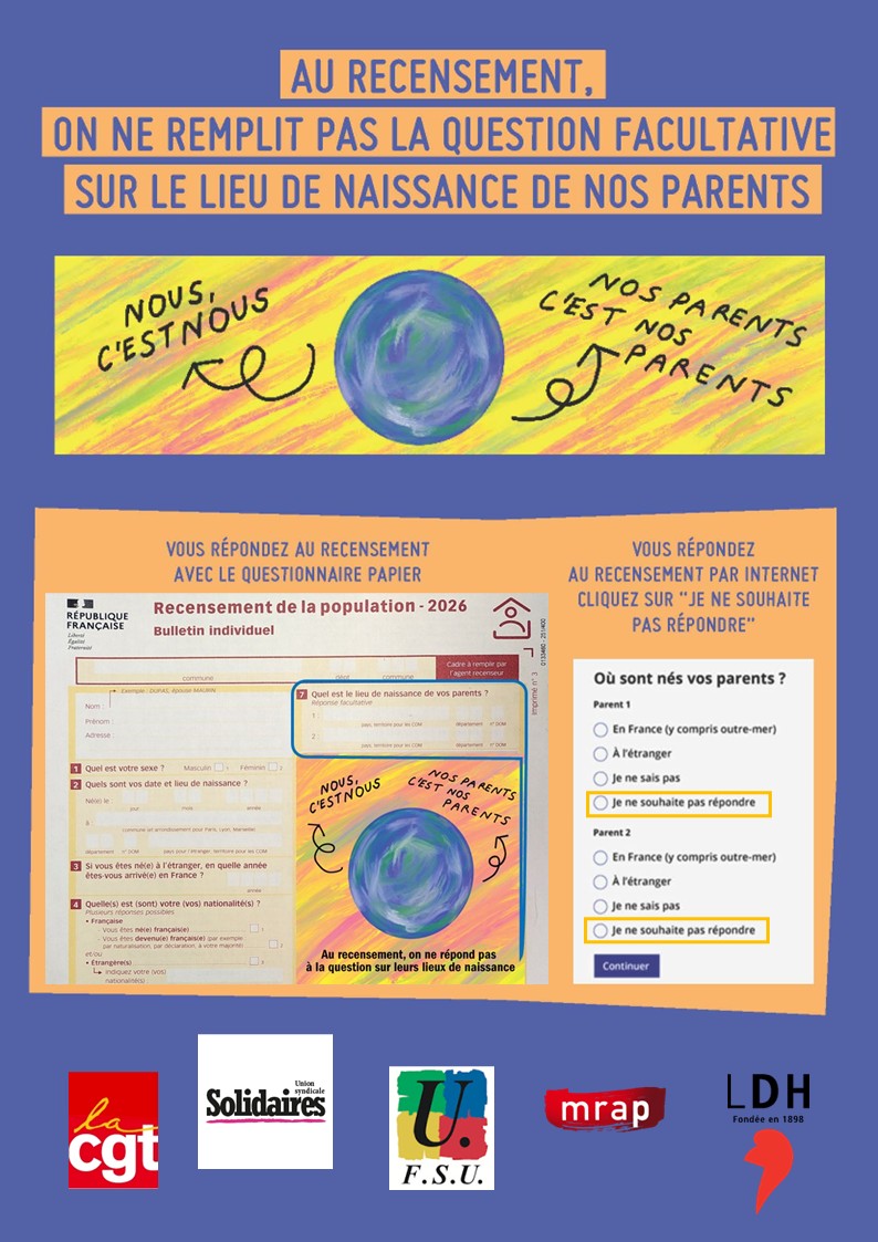 Depuis l’an dernier, il y a une nouvelle question qui ne porte pas sur nous, mais sur nos parents, pour savoir de quel pays ils viennent s’ils sont nés à l’étranger. Nos organisations refusent que, dans le recensement, chacune et chacun d’entre nous, soit défini-e par le lieu de naissance de ses parents.