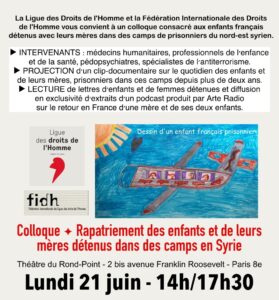 La Ligue des droits de l’Homme (LDH) et la Fédération internationale des droits de l’Homme (FIDH) vous convient à un colloque consacré aux enfants français détenus avec leurs mères dans des camps de prisonniers du nord-est syrien.
