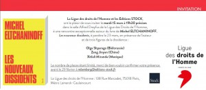 La LDH et les éditions Stock ont le plaisir de vous inviter le mardi 15 mars 2016, à 19h30, dans la salle Alfred Dreyfus de la Ligue des droits de l’Homme, à une rencontre exceptionnelle autour du livre de Michel Eltchaninoff Les Nouveaux dissidents, à paraître le 23 mars, en présence de trois figures de la dissidence :