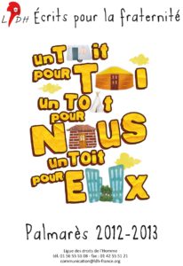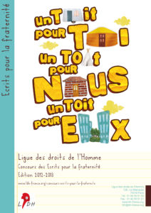 Chaque année, depuis 1991, la LDH organise le concours national « Ecrits pour la fraternité ». Le concours est ouvert aux classes de grande section de maternelle, de primaire, de collège, de lycée, d’établissement spécialisé mais aussi aux centres de loisirs et aux personnes à titre individuel. En proposant aux enfants et jeunes de s’exprimer librement sur un thème lié aux droits et libertés, l’association souhaite apporter sa contribution à la formation de celles et ceux qui seront les citoyennes et citoyens de demain.