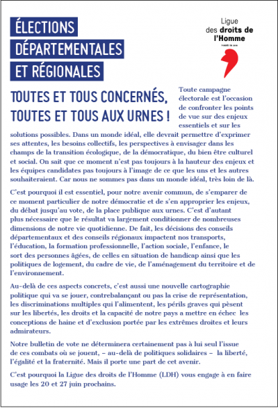 C’est pourquoi la Ligue des droits de l’Homme (LDH) vous engage à en faire usage les 20 et 27 juin prochains.